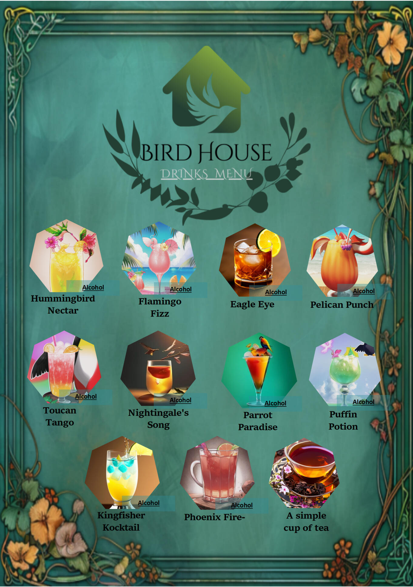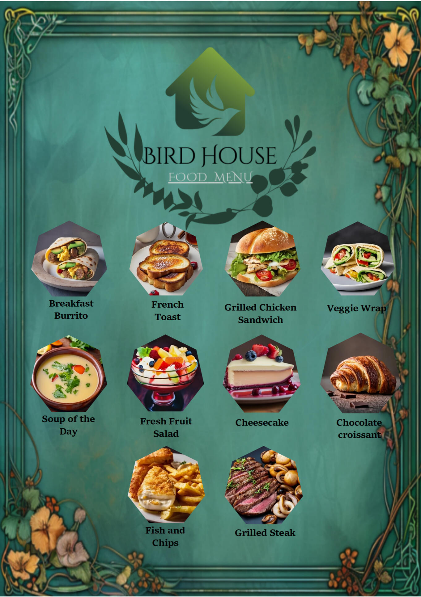 At "The Bird House cafe," our cozy little haven, we invite you to escape the world for a while. Come relax with us and let the sweet aromas of our freshly brewed coffee and baked goods uplift your senses. Our feathered friends may be the star attraction, but it's the warmth of our service and hospitality that will keep you coming back for more. So come spread your wings and join us in our humble abode. "The Bird House cafe," where every visit is a tweet to remember.